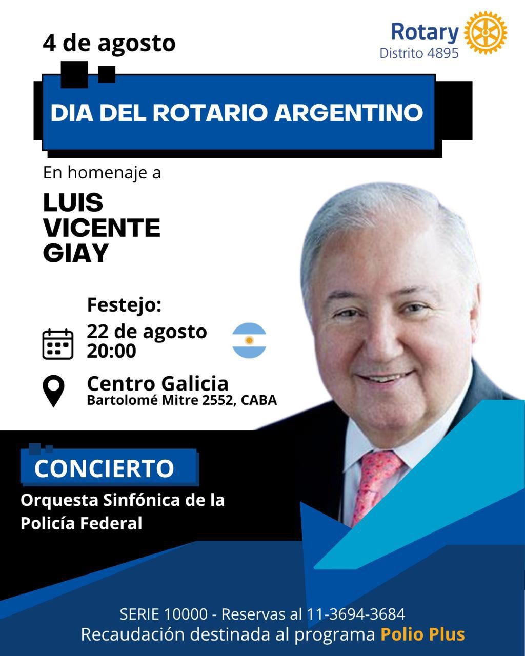 En homenaje a su figura y para celebrar esta fecha tan especial, el Distrito 4895 organiza el 22 de agosto a las 20 h un concierto en el Centro Galicia de Buenos Aires, a cargo de la prestigiosa Orquesta Sinfónica de la Policía Federal Argentina. La recaudación será destinada íntegramente al programa global End Polio Now, reafirmando una vez más que el espíritu rotario no solo se celebra: se ejerce.