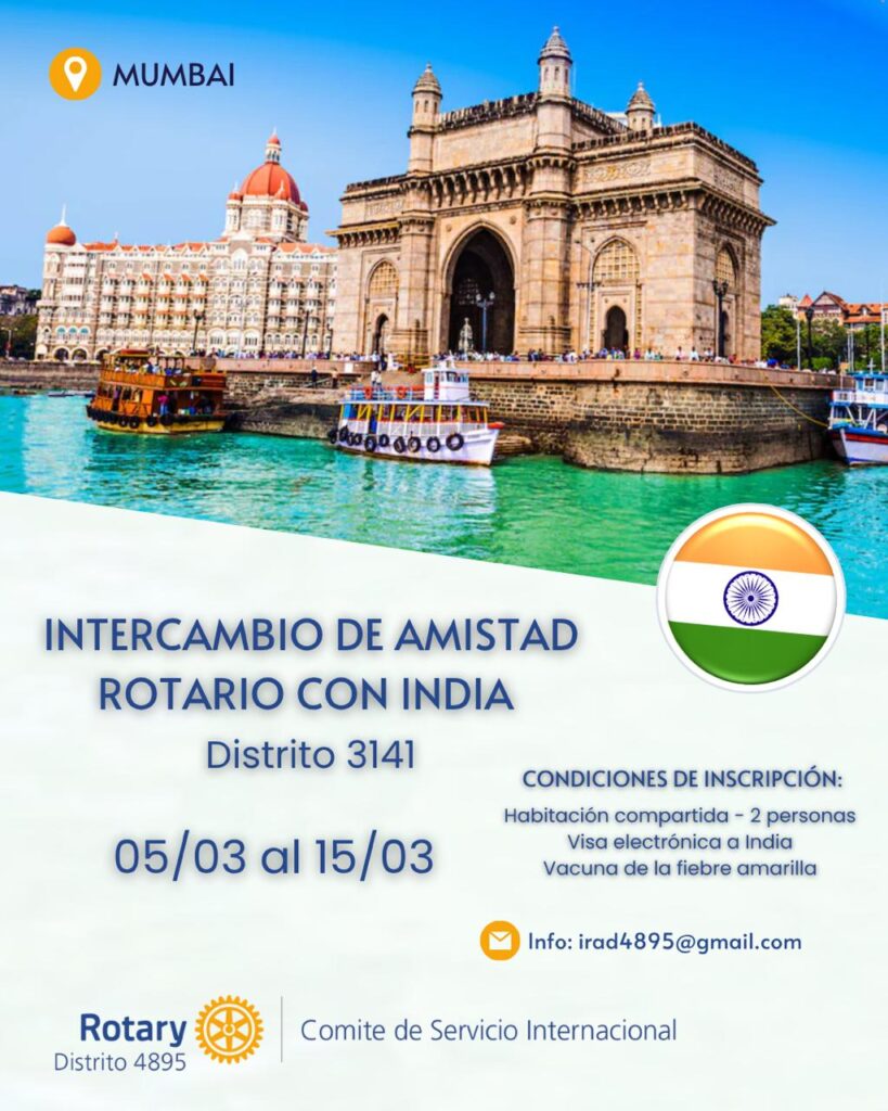 El Comité de Servicio Internacional del Distrito 4895 invita a todos los socios a participar de una experiencia rotaria única: el Intercambio de Amistad con el Distrito 3141 de India, que se llevará a cabo en la ciudad de Mumbai del 5 al 15 de marzo de 2026.