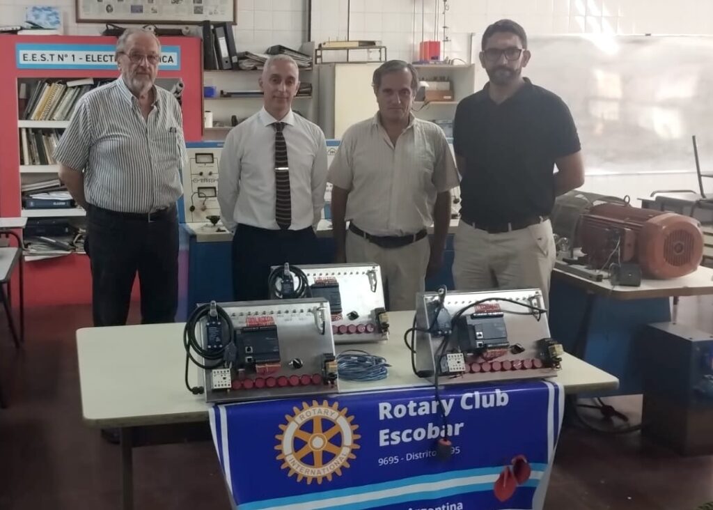 El Ing. Zenzerovich, titular de la empresa Ong Prodol y socio de nuestro club, elaboró y donó estos equipos a través del Rotary Club Escobar. Su empresa utiliza habitualmente PLC en las máquinas seleccionadoras de frutas y cítricos que fabrica y provee tanto al mercado nacional como al exterior. Es decir, se trata de tecnología real de uso industrial, aplicada hoy a la capacitación de los futuros técnicos.